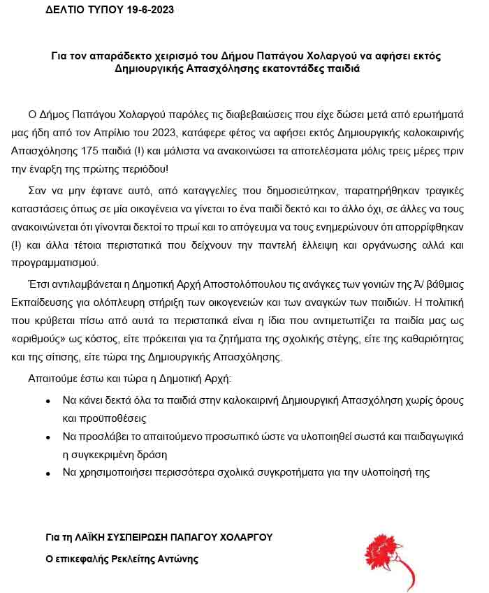 Η Λαϊκή Συσπείρωση για τη Θερινή Δημιουργική Απασχόληση του Δήμου